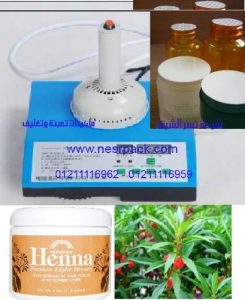 ماكينة لحام طبات الألمونيوم على فوهة برطمانات الحنة بواسطة الحث الكهروميغناطيسى موديل 201 المقدمة من شركة نسر الشرق ماكينات تعبئة وتغليف: